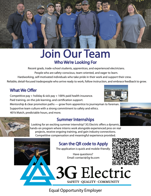 At 3G Electric, we take pride in providing high-quality electrical service across Southwest Kansas—and that starts with our people. We’re always looking for motivated, dependable individuals who want to grow with a company that values safety, integrity, and craftsmanship. Whether you’re an experienced electrician or just starting your career, we offer competitive pay, health and retirement benefits, a supportive team environment, and opportunities for advancement. Ready to join us?